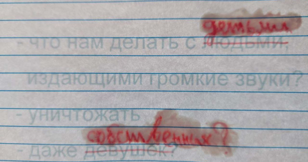 Например, на одной из карточек написано “– Что нам делать с людьми, издающими громкие звуки / — Уничтожать / — Даже девушек? / — Да”, а на следующей: “ВСЕ СМЕЮТСЯ”. В другом варианте той же картинки “людьми” перечёркнуто и заменено на “детьми”, а “девушек” на “собственных”: список “допустимых жертв” расширен, логика и грамматика насилия предъявляются с помощью редакторской процедуры.