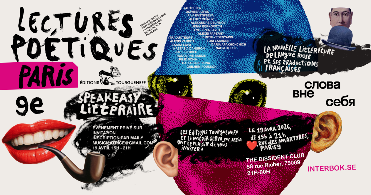 То, что произойдет 19 апреля, очень похоже на мою идею идеальных чтений. Писатели и поэты никогда не принадлежат одной культуре. Но чтобы это стало понятнее, их нужно сделать видимыми, нужен хороший перевод и ненапряжное общение в правильном месте. Полина в Éditions Tourgueneff и мы в словах_вне_себя делаем в сущности одно дело — повышаем видимость прекрасных авторов, пишущих на русском языке. На наших чтениях тексты, которые вышли в издательстве Полины, будут звучать и на русском, и в переводе. Зная авторов, могу точно сказать, что скучно не будет — всех одинаково интересно и читать, и слушать. Кроме того, мы будем продавать книжки, в том числе — и от уникального стокгольмского магазина Interbok, которые уже почти нигде нельзя купить. Это, например, поэтические книги независимых российских издательств, выходившие начиная с 2000-х.